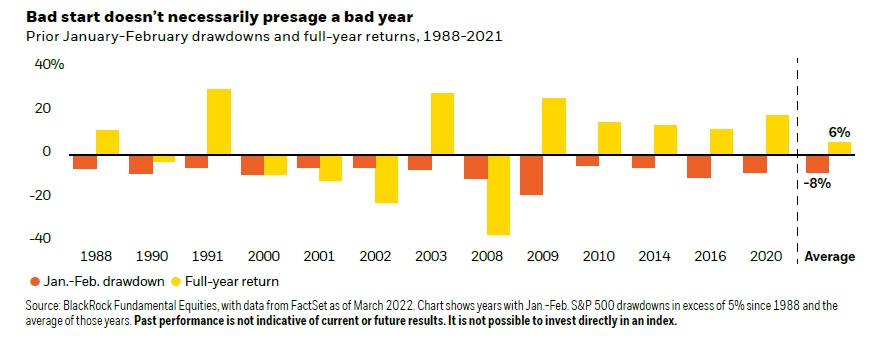 诚然,从美股市场的一些统计数据来看,开年艰难的局面并未影响美股在全年的涨势。贝莱德提供的统计数据显示,自1988年以来,标普500指数在1月至2月跌幅超过5%的年份里,平均年化回报率在6%左右。DeSpirito表示,该资管机构的另一观点是,在市场波动加剧之后,包括一些之前曾受到重创的成长型股票在内,短期和长期买入的良好时机正在形成。