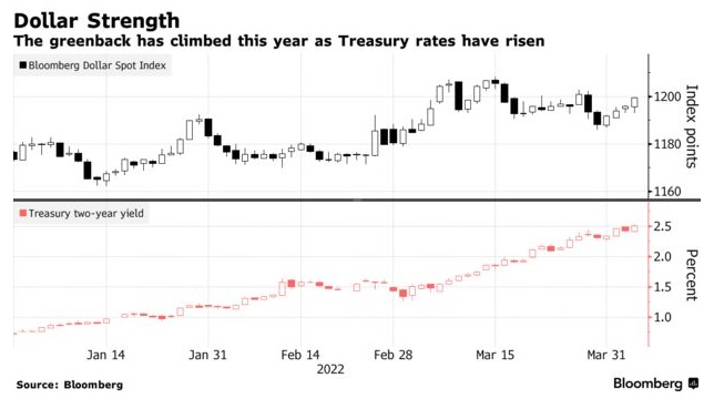 Bloomberg美元指数是一项衡量美元相对于一篮子其他货币的指标,该指数受到对美联储将更快收紧政策的预期的支撑,今年3月达到了自2020年年中以来的最高水平。周二的走势凸显了这种联系,美国公债收益率的上涨再次推高了美元。