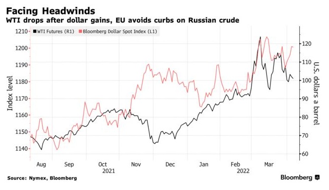 智通财经APP获悉,由于欧盟暂时回避对俄罗斯石油的制裁,以及美元走强削弱了大宗商品的吸引力,油价出现下跌。截至发稿,WTI原油期货继周二下跌1.3%后,周三跌至每桶101.84美元;布伦特原油期货报每桶106.76美元。