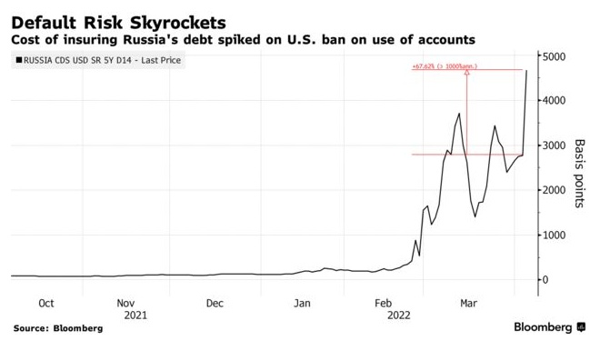 数据显示,在美国财政部停止俄罗斯政府通过在美国银行开设的账户支付美元债务后,俄罗斯违约概率已经在周一升至77.7%,在2月24日俄乌冲突升级时,该数据为24.1%。