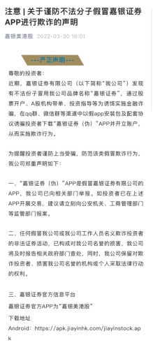 笔者通过查阅嘉银证券官网、APP及微信公众号,均看到嘉银证券发布了多条相关反诈公告。