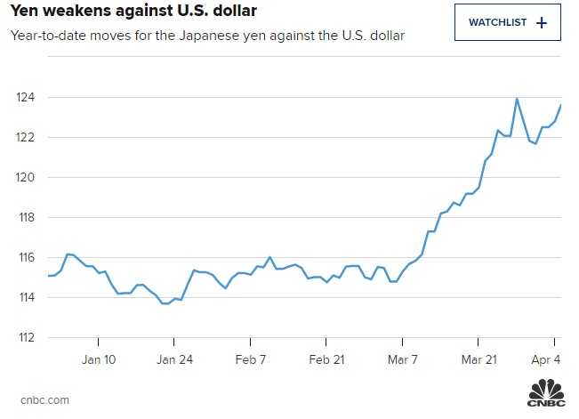 Sakakibara表示,如果美元兑日元汇率超过130,日本央行将会“警觉”。据悉,由于地缘政治动荡扰乱了全球市场,日元遭受重创,3月日元兑美元汇率下跌超过5%。