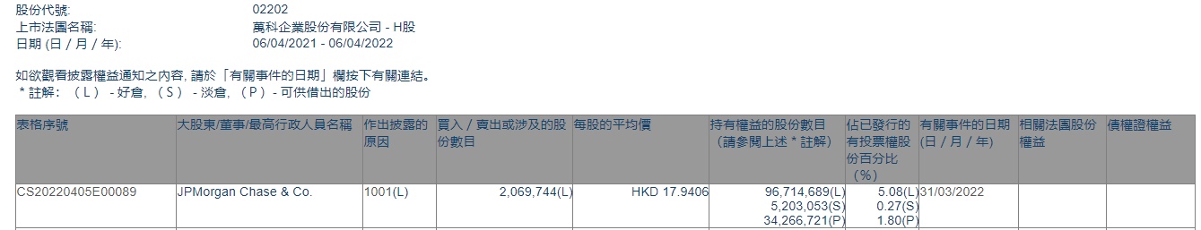 智通财经APP获悉,香港联交所最新资料显示,3月31日,小摩增持万科企业(02202)206.9744万股,每股作价17.9406港元,总金额约为3713.24万港元。增持后最新持股数目约为9671.47万股,最新持股比例为5.08%。