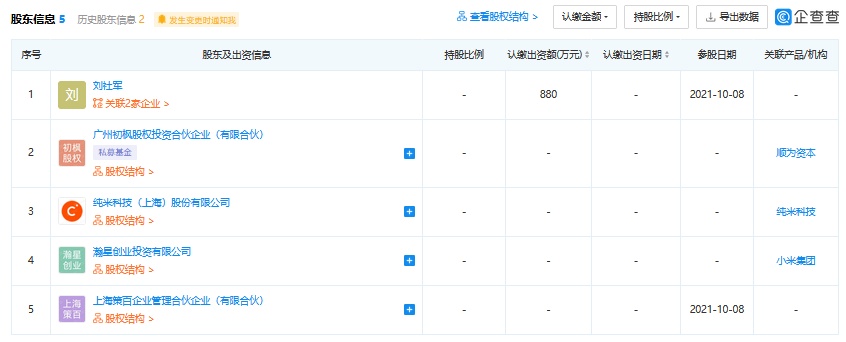 智通财经APP获悉,企查查APP显示,近日,佛山市芯耀环保科技有限公司发生工商变更,新增小米关联公司瀚星创业投资有限公司、纯米科技(上海)股份有限公司等为股东。