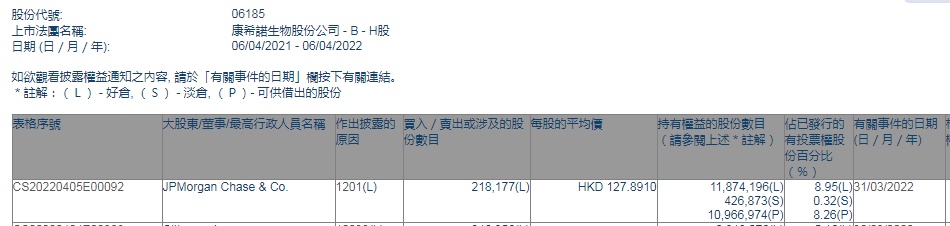 智通财经APP获悉,香港联交所最新资料显示,3月31日,小摩减持康希诺生物-B(06185)21.8177万股,每股作价127.8910港元,总金额约为2790.29万港元。减持后最新持股数目约为1187.42万股,最新持股比例为8.95%。