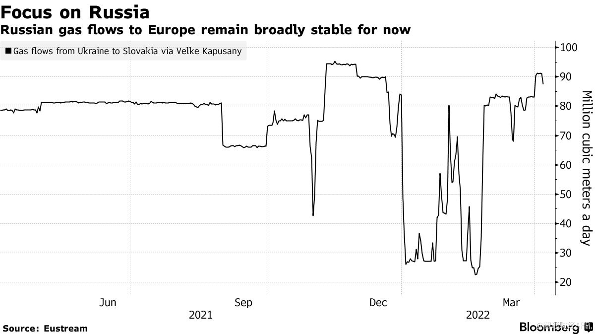 大量液化天然气流入欧洲大陆,再加上气温攀升,也有助于控制天然气价格。不过,来自俄罗斯的供应仍然是焦点,尤其是在俄罗斯总统普京要求欧盟买家以卢布支付天然气费用之后。目前俄罗斯流向欧洲的天然气供应大体保持稳定。