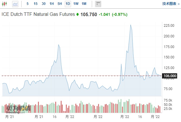 智通财经APP获悉,欧洲天然气价格在连续四天下跌后出现波动,因为欧盟尚未就禁止进口俄罗斯天然气达成统一意见,且目前俄罗斯天然气供应保持稳定。截至发稿,荷兰TTF天然气期货价格跌0.97%,报每兆瓦时105.75欧元。