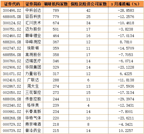 具体到上市公司调研来看,中科创达接受了789家机构调研,调研机构数量居首。埃斯顿获机构调研频次最高,3月内曾获22次调研。此外,在此次3月份调研名单中,普洛药业涨幅居前,累涨10.23%。以下为调研机构数排名前20的上市公司名单。