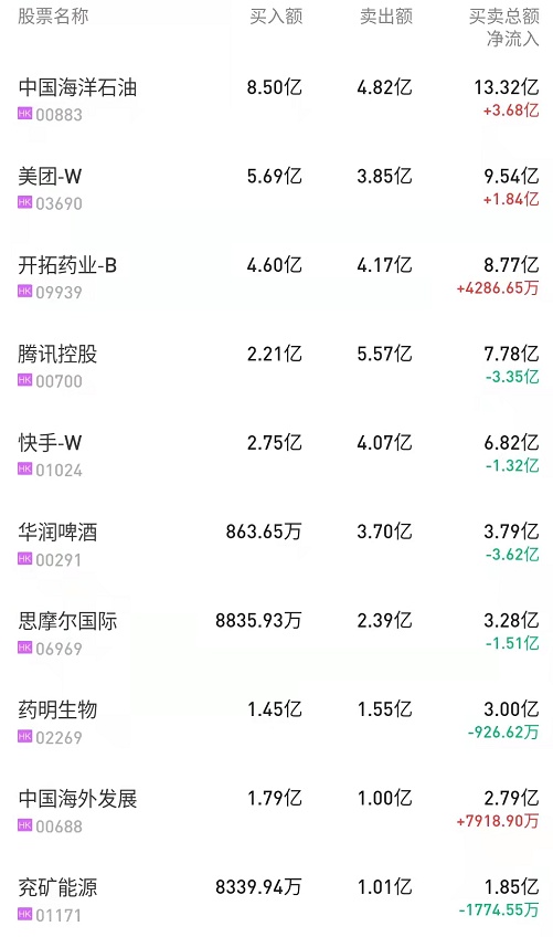北水净买入最多的个股是中海油(00883)、美团-W(03690)、中国海外发展(00688)。北水净卖出最多的个股是腾讯(00700)、华润啤酒(00291)、工商银行(01398)。