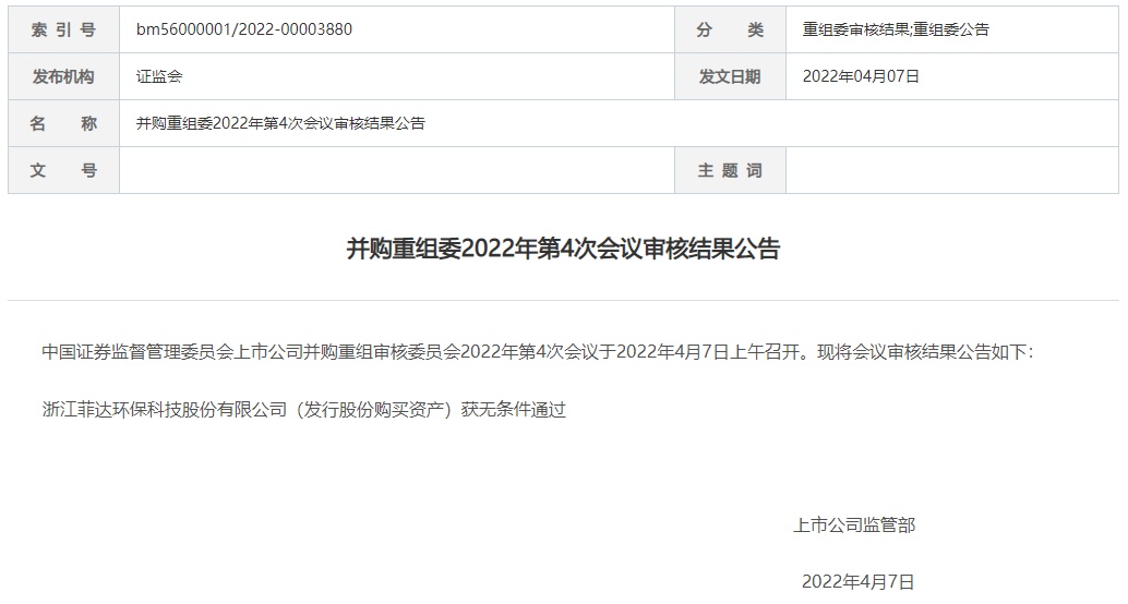 智通财经APP获悉,4月7日,中国证券监督管理委员会上市公司并购重组审核委员会公布2022年第4次会议审核结果,浙江菲达环保科技股份有限公司(菲达环保,600526.SH)发行股份购买资产获无条件通过。
