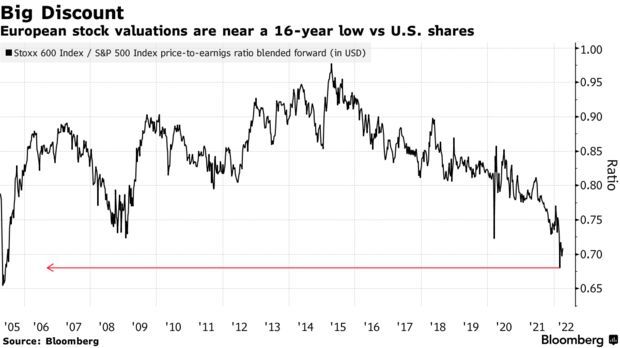 欧洲股市在2021年上涨逾20%,但在进入2022年之后便一直承压,原因在于投资者对俄乌冲突、通胀高企和鹰派货币政策的担忧打压了风险偏好。Ross MacDonald指出,与全球同行相比,欧洲股市的估值越来越低,这反映出未来几个月盈利预期可能被下调的风险。
