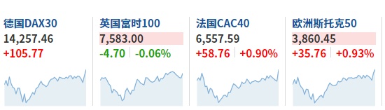 截至发稿,英国富时100指数跌0.06%,德国DAX指数涨0.76%、法国CAC40指数涨0.9%、欧洲斯托克50指数涨0.93%。