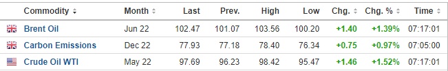 截至发稿,WTI原油涨1.52%,报97.69美元/桶。布伦特原油涨1.39%,报102.47美元/桶。