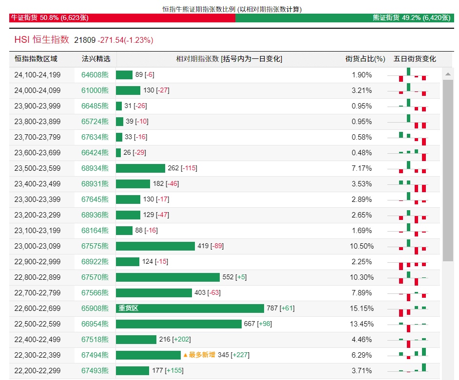 法兴恒指牛熊证街货分布图中的数据显示,熊证街货重货区在22600-22699区间,该区间最新熊证数量为787张,较上一交易日增加61张;最多新增在22300-22399区间,该区间最新熊证数量为345张,较上一交易日增加277张。