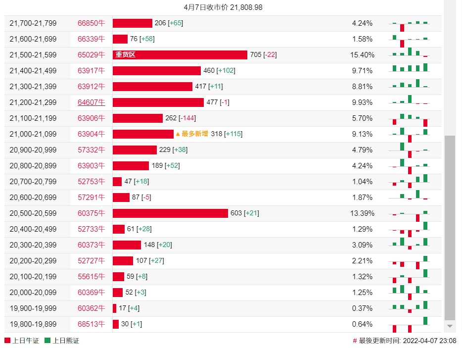 牛证街货重货区在21500-21599区间,该区间最新牛证数量为705张,较上一交易日减少22张;最多新增在21000-21099区间,该区间最新牛证数量为318张,较上一交易日增加115张。
