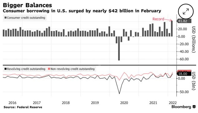 智通财经APP获悉,美国2月消费者借贷创下纪录新高,反映出信用卡余额和非循环贷款均大幅增加。