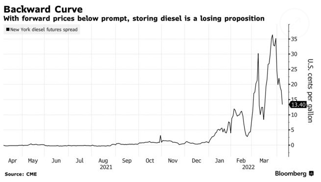 在俄乌冲突升级后,全球石油供应收紧,油价迅速飙升,柴油、航空燃料和汽油期货市场出现了广泛的现货溢价现象,即未来交割的价格低于现货价格。本月,现货溢价的现象有所缓和,但储罐内的燃料每天都在贬值,这仍然是事实。