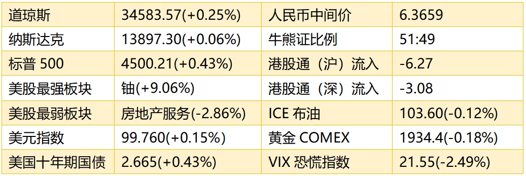 1.隔夜美股截至收盘,道指涨87.06点,涨幅为0.25%,报34583.57点;纳指涨8.48点,涨幅为0.06%,报13897.30点;标普500指数涨19.06点,涨幅为0.43%,报4500.21点。港股ADR指数下跌,按比例计算,收报21683点,较香港收市跌124.74点,幅度为0.58%。