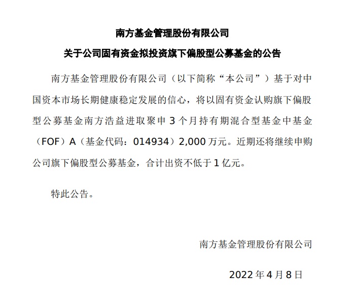 智通财经APP获悉,4月8日, 南方基金发布公告称,基于对中国资本市场长期健康稳定发展的信心,将以固有资金认购旗下偏股型公募基金南方浩益进取聚申 3 个月持有期混合型基金中基金(FOF)A(基金代码:014934)2,000 万元。近期还将继续申购公司旗下偏股型公募基金,合计出资不低于1亿元。