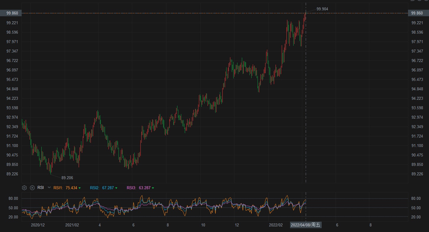 亚洲市场早盘,美元指数一度升至99.904,逼近100点这一重要关口,自4月5日之后美指今日又一次创下自2020年5月以来的最高水平。受美联储多位政策制定者呼吁加快加息步伐以遏制快速通胀的鹰派言论支撑,该指数本周涨幅达到1.3%,或将迎一个月以来最大单周涨幅。本周公布的美联储3月会议纪要显示,“多数”政策制定者倾向于在未来几个月将基准利率提高50个基点。