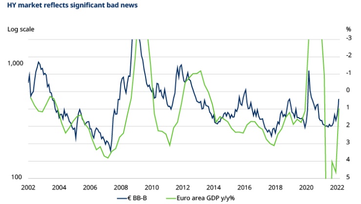 欧洲高收益债券市场对经济因素更为敏感,并对近期事件做出了强烈反应。欧洲高收益债券的利差与欧洲经济增长放缓至接近0%的情况相符合,至少技术性衰退情况是一致的。