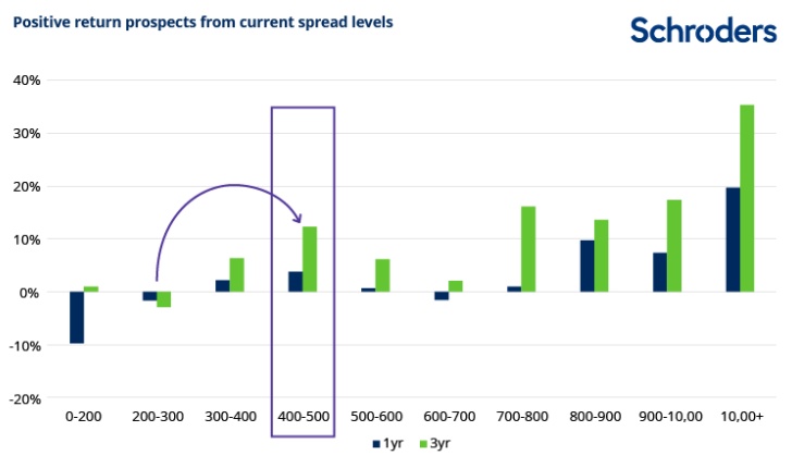 从历史上看,欧元高收益债券的1年期和3年期利差在400-500个基点水平上的超额回报一直不错。与一年前相比,收益前景有所改善,当时利差约为目前的一半。