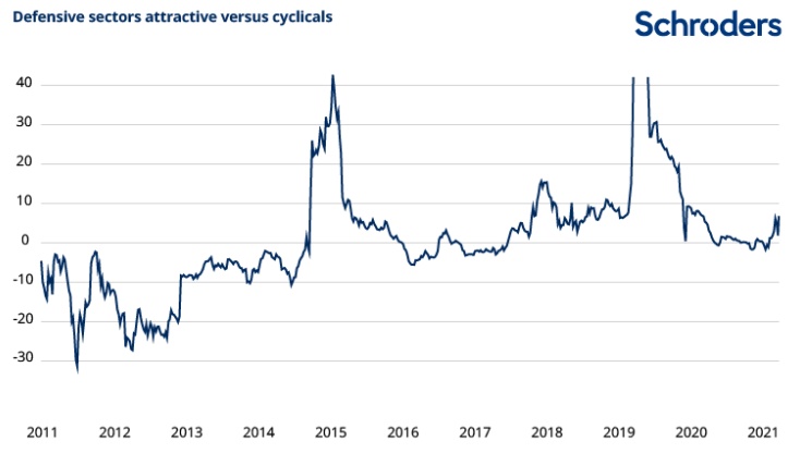 下图显示了非周期性(电信、公用事业和非周期性消费)与周期性行业(基础工业、资本品、周期性消费、能源、技术和运输)的利差。施罗德集团认为,相对于周期性走势,非周期性板块价差仍有表现良好的空间。