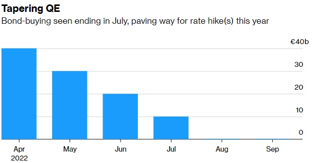 欧洲央行官员们最近的言论表明,大多数官员都同意在夏季结束资产购买,并在年底前加息。不过,在3月份就如何应对战争影响出现分歧后,在利率何时以及以多快的速度攀升的问题上仍存在分歧。