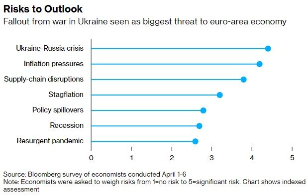 经济学家将俄乌冲突和通胀列为欧元区经济前景面临的两大危险,这让欧洲央行陷入了两难境地:抑制价格上涨的鹰派行动可能会扼杀疫情后经济反弹的势头;继续实施刺激政策可能会引发恶性通胀。