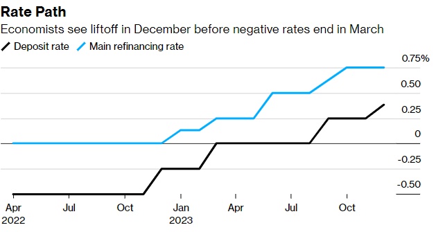 德意志银行也指出欧洲央行加息0.5个百分点的可能性。同样地,市场认为会出现更激进的加息,投资者押注欧洲基准利率到今年底将升至零水平。