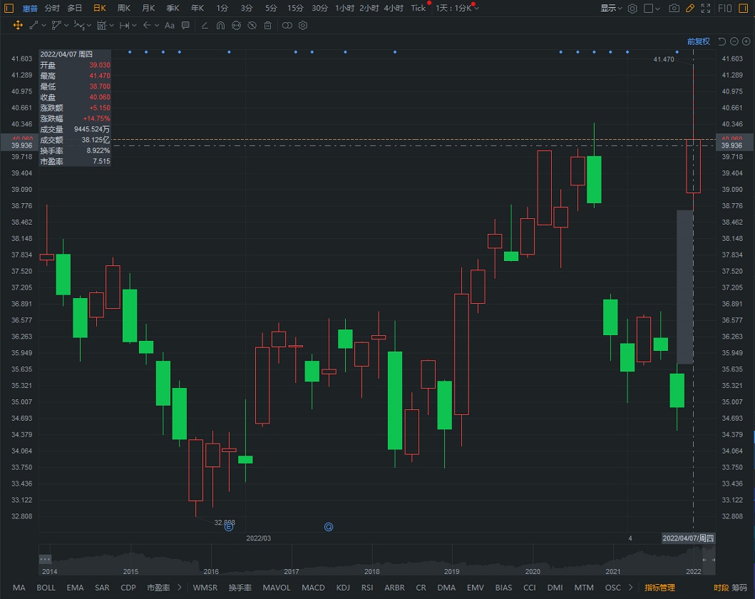 不出所料,受此消息提振,惠普周四美股收盘大涨14.75%,报40.06美元。