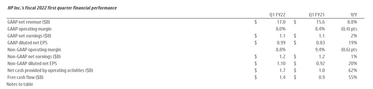 诚然,个人电脑和打印机市场的增长前景并不乐观,但惠普的业绩表明,该公司的营收增长虽然缓慢、但足够稳定。从近5年业绩来看,惠普表现相当亮眼,公司收益连续8个季度均超出了市场的普遍预期。最新数据显示,该公司2022财年第一季度营收170亿美元,高于市场预期,同比增长8.8%;净利润为10.86亿美元,同比增长2%。