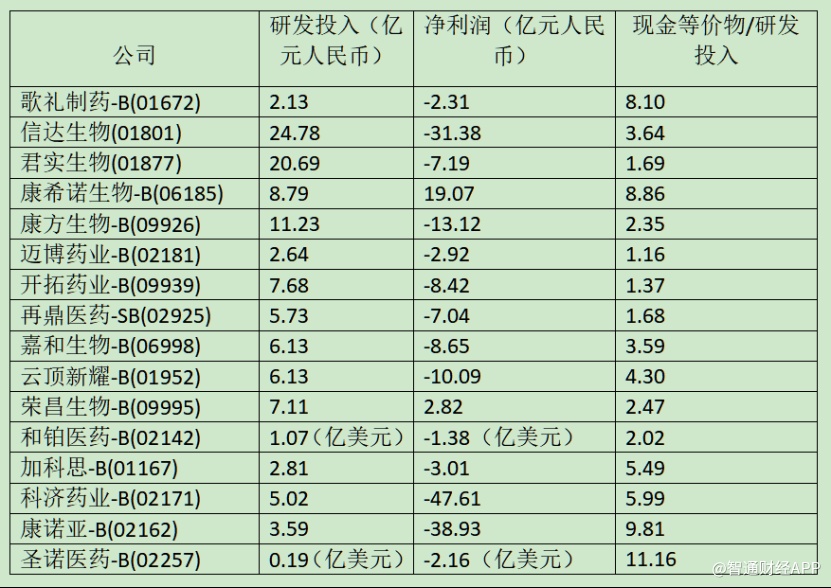 正如上文提到,18A公司的压力主要来自于自身高额的创新研发投入。据最新的2021年年报,有8家biotech的现金不足以维持2.5年以上的研发投入,其中4家撑不过2年的研发投入。也正是在巨额研发投入下,部分港股18A企业亏损情况较为严重。