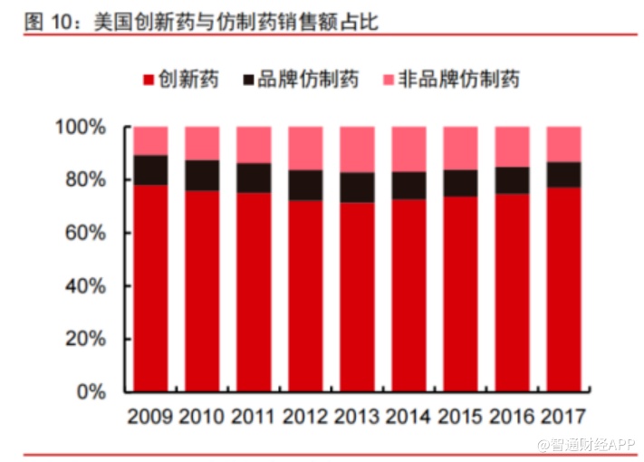 以美国制药市场为例,尽管美国近10年内的仿制药处方量一直攀升,但销售额仍然是创新药占绝对的领先地位,常年占据80%的药品市场。对于国内市场而言,数据显示,2019年中国药品终端市场销售额为17955亿元,预计目前国内创新药市场占比不到 10%,与美国的80%相比有巨大的发展空间。