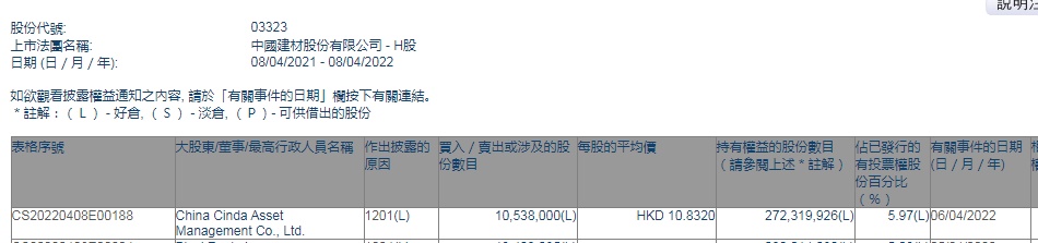 CO.,Ltd.减持中国建材(03323)1053.8万股,每股作价10.832港元,总金额约为1.14亿港元。减持后最新持股数目约为2.72亿股,最新持股比例为5.97%。