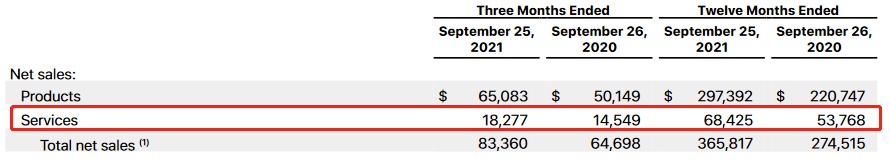 数据显示,2020财年,苹果服务业务营收537.68亿美元,同比增长16.2%,营收占比达19.6%;2021财年,苹果服务业务营收684.25亿美元,同比增长27.3%,营收占比达18.7%。