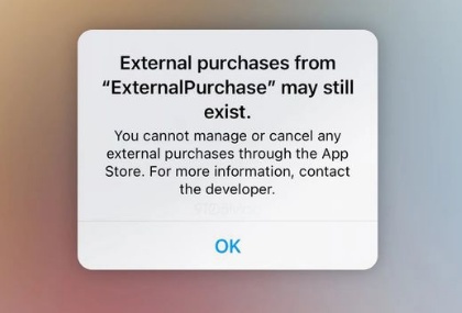 据悉,这也将带来一些改变,比如用户删除了一个外部购买的应用,iOS将显示一条提醒,指出将无法通过App Store管理购买和订阅,苹果无法控制用户在其平台之外购买的内容或应用程序。另外,代码还显示,苹果还将在用户首次打开提供外部购买的应用程序时添加一道新提醒。