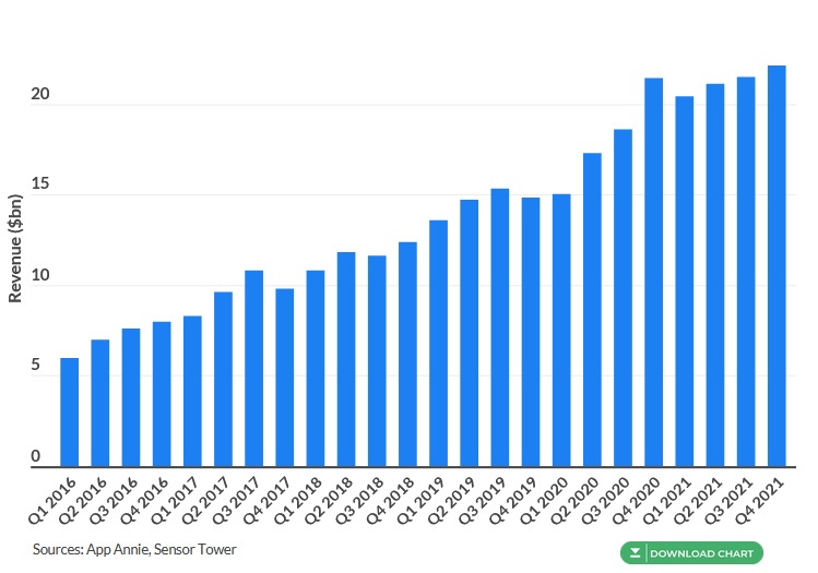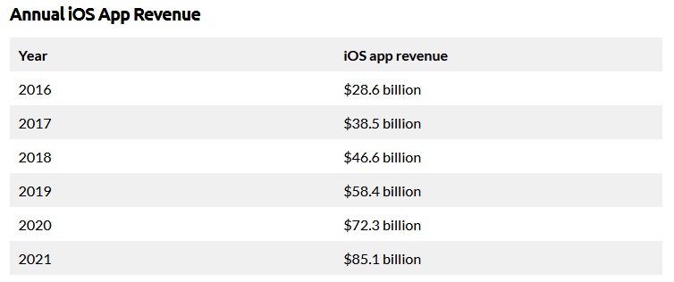 移动应用数据分析平台Sensor Tower的报告显示,2021年全年,iOS应用程序营收为851亿美元,较2020年的723亿美元增长17.7%,不过相比2020年23.8%的同比涨幅有所下降。