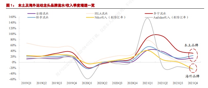 综上所述,2021年原本突出的产品力和性价比、叠加顶级赛事、运动员、明星及 KOL营销资源倾斜下的国货龙头增长亮眼,显著优于海外品牌。体育生活方式的兴起,“国潮”连接着全民健身、运动生活普及后的现实产品需要,市场机遇和挑战随之而来。未来国产运动品牌将在各自的战略指引下,不断挖掘品牌增长潜力。