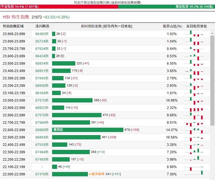 法兴恒指牛熊证街货分布图中的数据显示,熊证街货重货区在22600-22699区间,该区间最新熊证数量为679 张,较上一交易日减少108张;最多新增在22000-22099区间,该区间最新熊证数量为341张,较上一交易日增加341张。