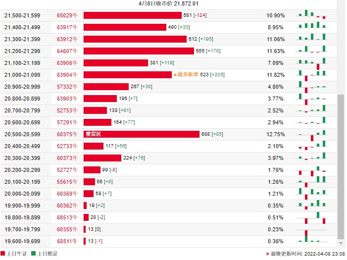 牛证街货重货区在20500-20599区间,该区间最新牛证数量为688张,较上一交易日增加85张;最多新增在21000-21099区间,该区间最新牛证数量为523张,较上一交易日增加205张。