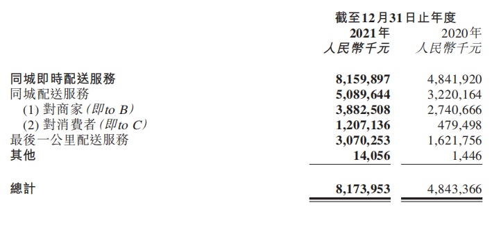 体现在财务上,全场景模式实现显著收入增长,其中非餐场景收入增速为105%;来自医药行业、服装行业及数码3C(电脑、通讯及消费性电器)行业商家配送的收入同比增长超过165%;来自近场电商及同城零售场景(涵盖商超生鲜、鲜花绿植、甜点及其他日用百货等类别)商家配送的收入同比增长超过95%;面向消费者的同城配送收入更是连续三年保持在150%以上,2021年同比增长152%,均高于公司整体收入增速。