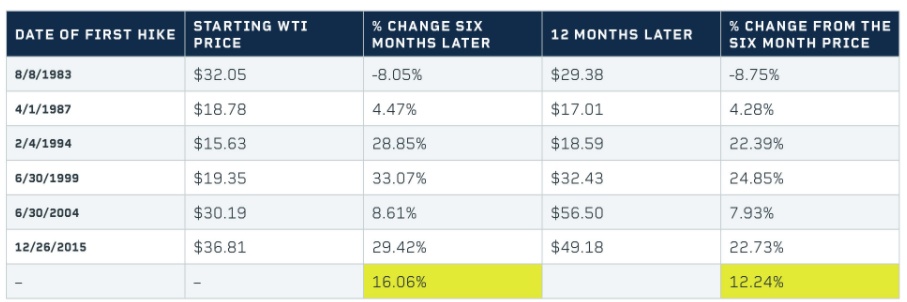 如果将这一周期的首次加息和加息后WTI原油价格的变动计算在内,这一平均涨幅将升至16.60%。