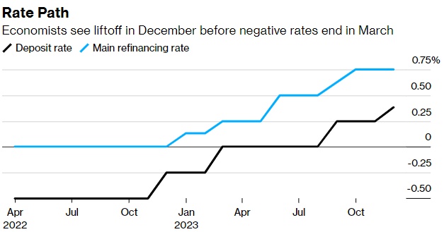 智通财经曾报道,高盛上周五加入货币市场的行列,预计欧洲央行将在今年9月和12月各加息25个基点。摩根士丹利预计欧洲央行将在12月加息,之后继续逐步加息。荷兰国际集团经济学家Carsten Brzeski上周四表示,物价上涨持续时间较长,可能"令欧洲央行极度恐慌",以致于"9月加息50个基点";不过Brzeski的基本预测是9月份首次加息25个基点。德意志银行也指出欧洲央行加息0.5个百分点的可能性。同样地,市场认为会出现更激进的加息,投资者押注欧洲基准利率到今年底将升至零水平。