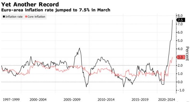 在本次会议上,官员们还可能讨论一种危机工具,以便在资产购买计划结束后,欧元区中较弱经济体债券收益率出现飙升的情况下使用。根据欧洲央行的报告,在通胀达到创新高的7.5%并可能还未达到峰值后,3月份的会议对通胀将如何持续产生了“不同的看法”。