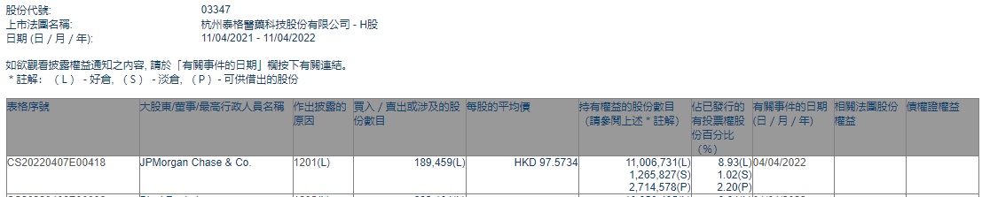 智通财经APP获悉,香港联交所最新资料显示,4月4日,小摩减持泰格医药(03347)18.9459万股,每股作价97.5734港元,总金额约为1848.62万港元。减持后最新持股数目约1100.67万股,最新持股比例为8.93%。