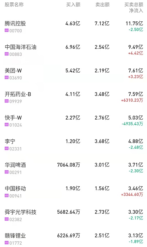 北水净买入最多的个股是美团-W(03690)、中海油(00883)、安踏体育(02020)。北水净卖出最多的个股是李宁(02331)、华润啤酒(00291)、腾讯(00700)。