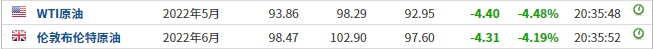 3. 截至发稿,WTI原油跌4.48%,报93.86美元/桶。布伦特原油跌4.19%,报98.47美元/桶。