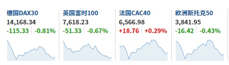 2. 截至发稿,德国DAX指数跌0.81%,英国富时100指数跌0.67%,法国CAC40指数涨0.29%,欧洲斯托克50指数跌0.43%。