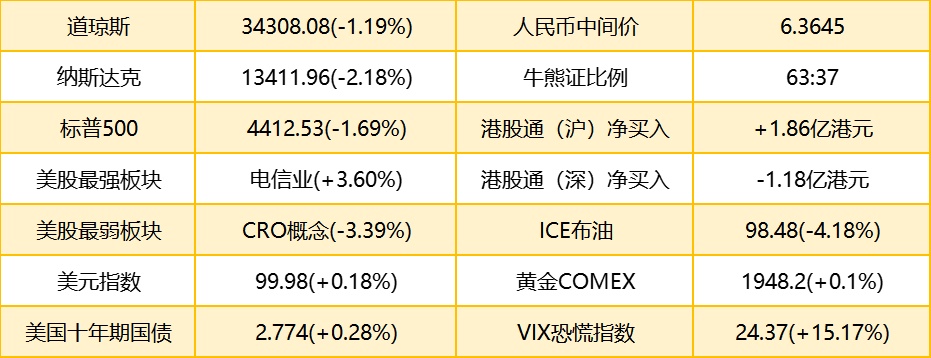 1. 上周末美股截至收盘,三大指数全线收跌,道琼斯指数下跌413.04点,收报34308.08点,跌幅1.19%;纳斯达克指数下跌299.04点,收报13411.96点,跌幅2.18%;标普500指数下跌75.75点,收报4412.53点,跌幅1.69%。港股ADR指数上涨,按比例计算,收报21322点,较香港收市涨114.35点或0.54%。